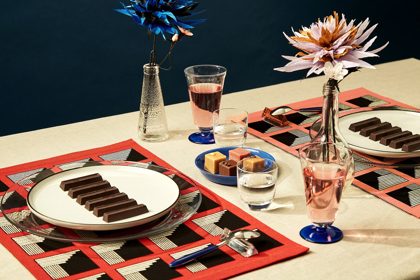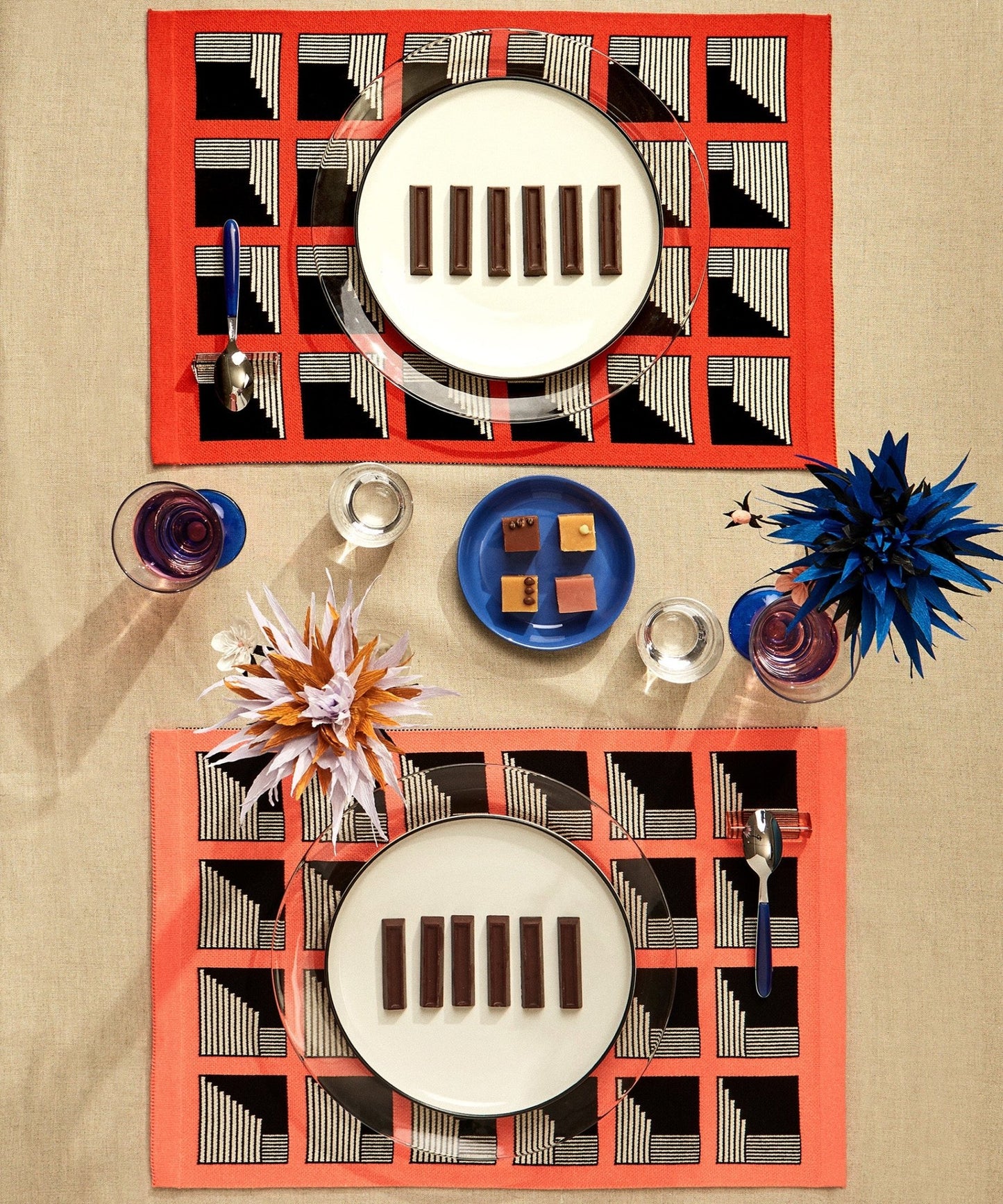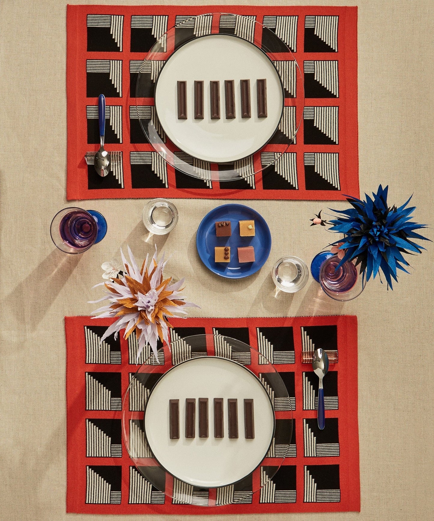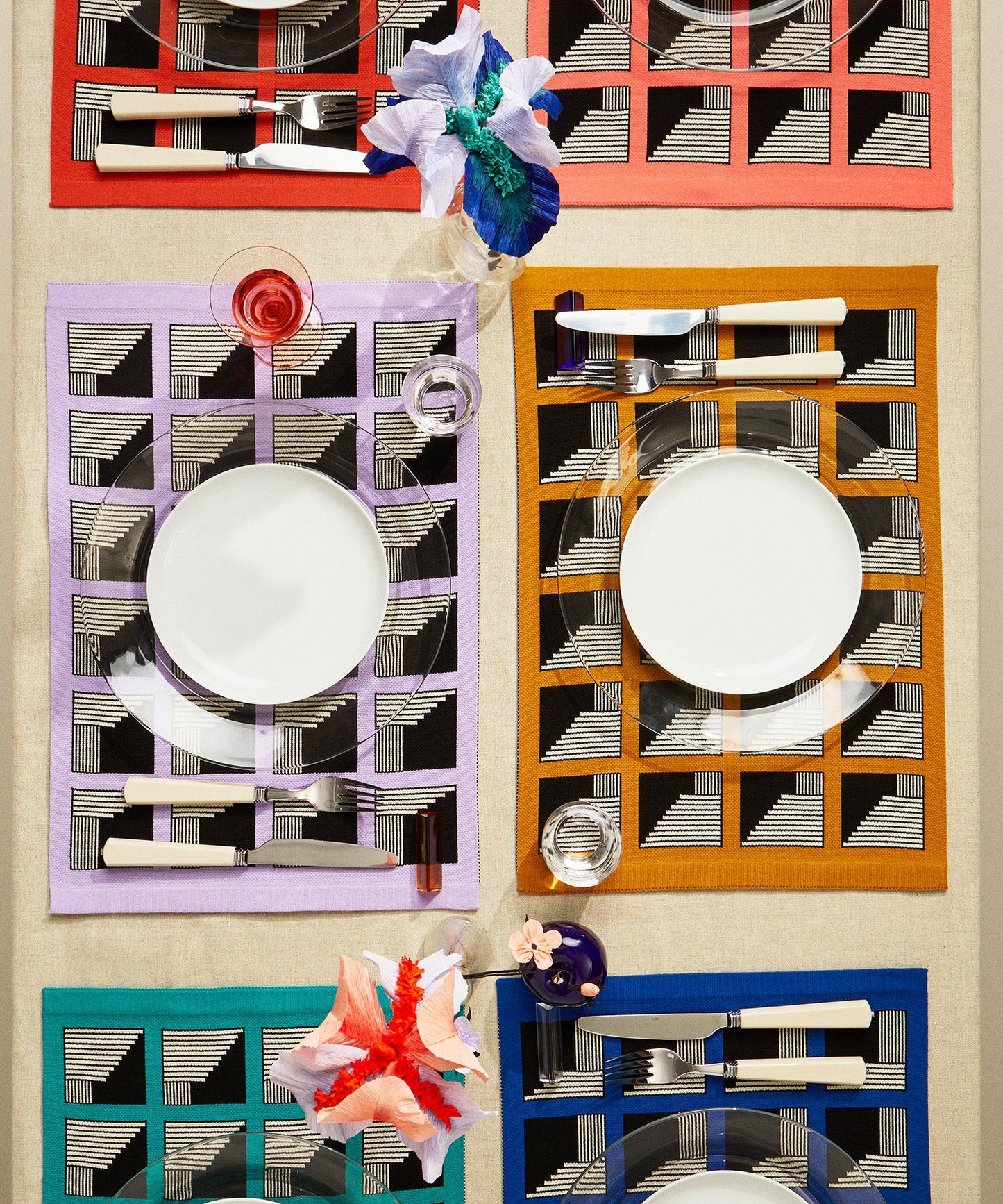 The movement of natural light hitting a building’s facade throughout the day is what inspired the design for these graphic tablescaping pieces. The varying angles give these knitted mats a sense of depth, turning the flat tabletop into a 3D domain.